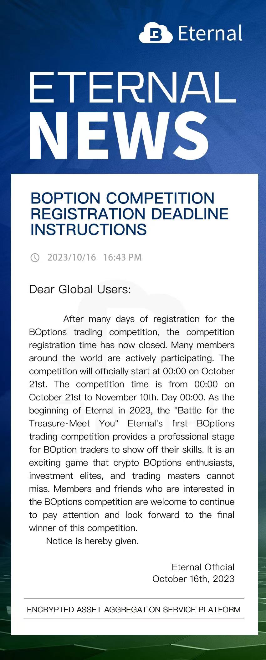 Eternal's first global options competition is about to begin