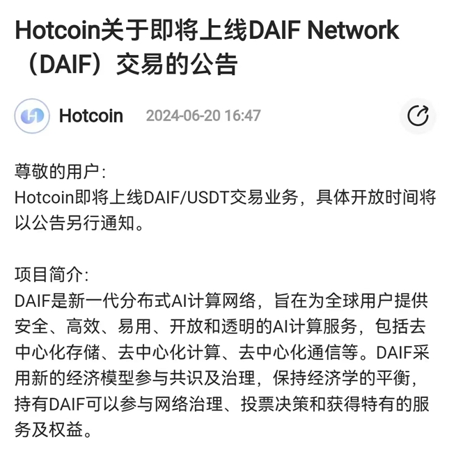 随着DAIF在Hotcoin交易所的正式上线,我们有理由相信,这场由DAIF引领的分布式AI计算革命将愈演愈烈,为全球用户带来更多惊喜和可能性。让我们共同期待DAIF在Hotcoin交易所的精彩表现,见证这一技术革命带来的更多辉煌成果!